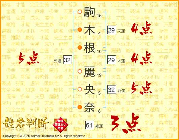 駒(15画)木(4画)根(10画) 麗(19画)央(5画)奈(8画)