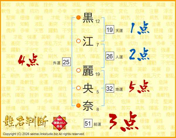 黒(12画)江(7画) 麗(19画)央(5画)奈(8画)