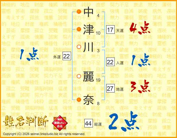 中(4画)津(10画)川(3画) 麗(19画)奈(8画)