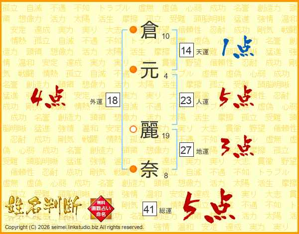 倉(10画)元(4画) 麗(19画)奈(8画)