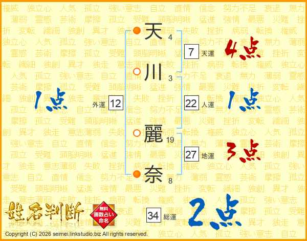 天(4画)川(3画) 麗(19画)奈(8画)