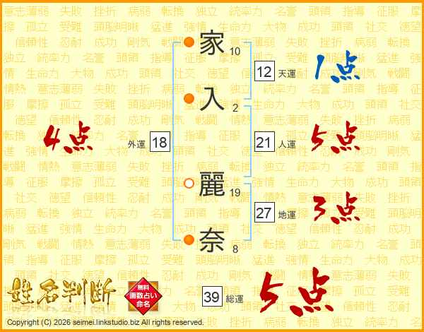 家(10画)入(2画) 麗(19画)奈(8画)