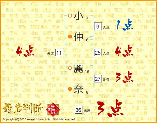 小(3画)仲(6画) 麗(19画)奈(8画)
