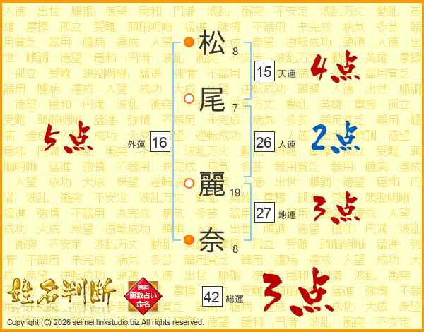 松(8画)尾(7画) 麗(19画)奈(8画)