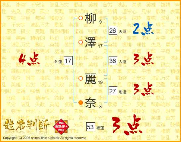 柳(9画)澤(17画) 麗(19画)奈(8画)