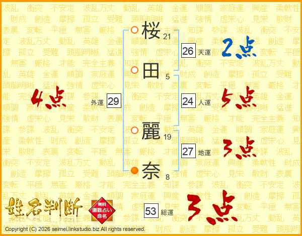 桜(21画)田(5画) 麗(19画)奈(8画)