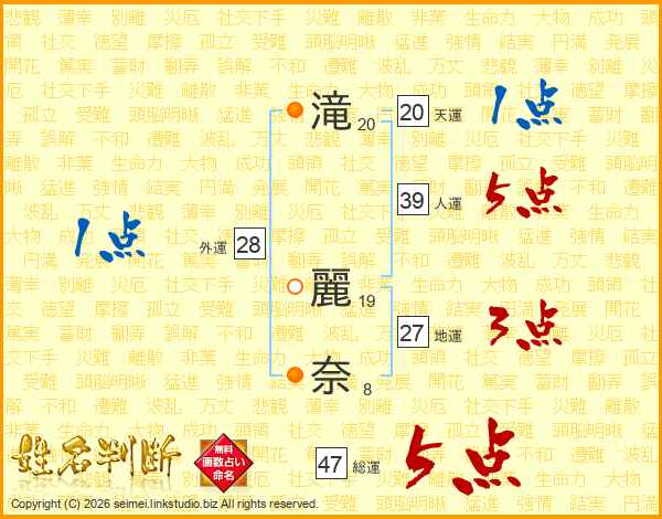 生活面を象徴する運勢です。外部から受ける影響力を表し、結婚運、家庭運や職場、環境への順応性を表します。総運から人運を引いた画数。姓や名が1文字の場合を除く。