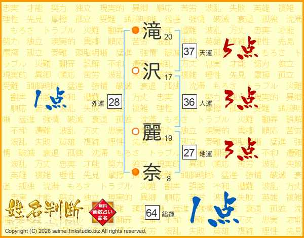 滝(20画)沢(17画) 麗(19画)奈(8画)