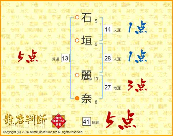 石(5画)垣(9画) 麗(19画)奈(8画)