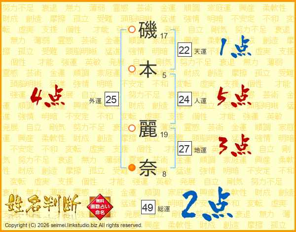 磯(17画)本(5画) 麗(19画)奈(8画)