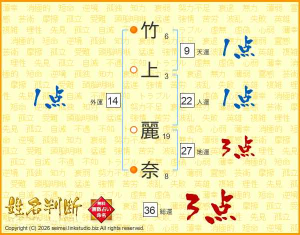 竹(6画)上(3画) 麗(19画)奈(8画)
