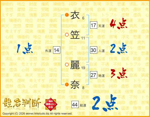 衣(6画)笠(11画) 麗(19画)奈(8画)