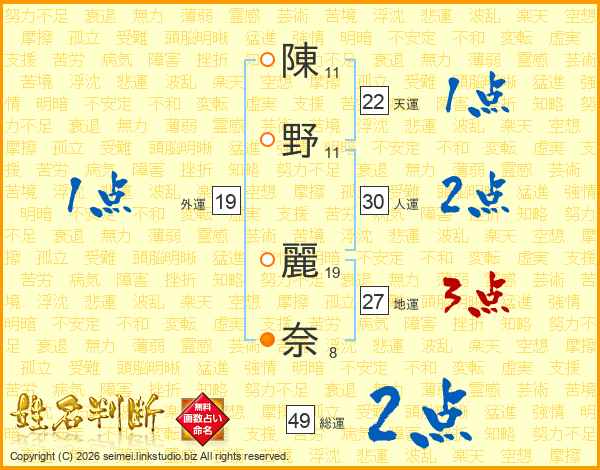 陳(11画)野(11画) 麗(19画)奈(8画)