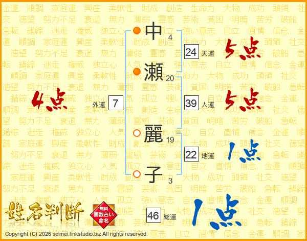 中(4画)瀬(20画) 麗(19画)子(3画)