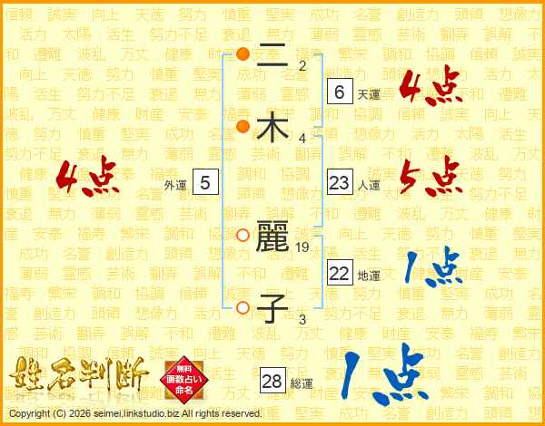 二(2画)木(4画) 麗(19画)子(3画)
