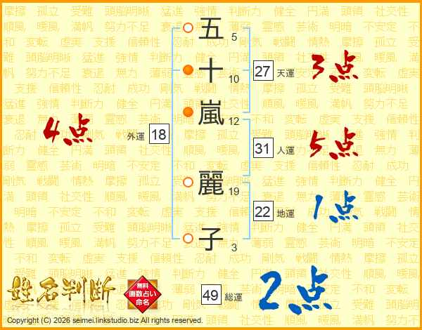 五(5画)十(10画)嵐(12画) 麗(19画)子(3画)