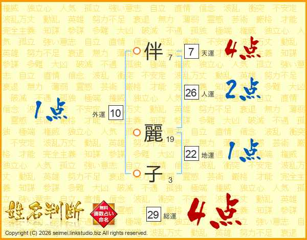 生活面を象徴する運勢です。外部から受ける影響力を表し、結婚運、家庭運や職場、環境への順応性を表します。総運から人運を引いた画数。姓や名が1文字の場合を除く。