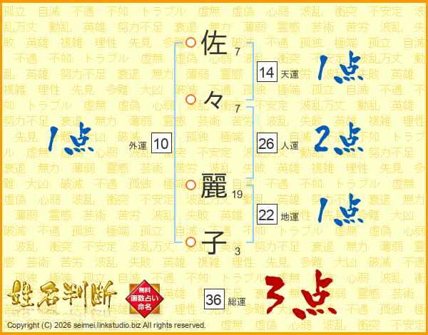 佐(7画)々(7画) 麗(19画)子(3画)