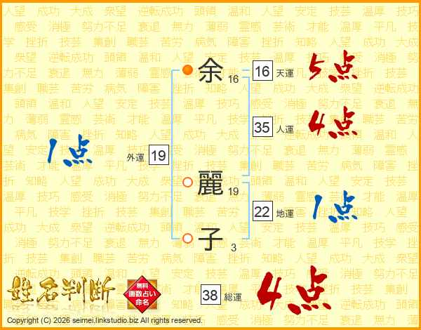 生活面を象徴する運勢です。外部から受ける影響力を表し、結婚運、家庭運や職場、環境への順応性を表します。総運から人運を引いた画数。姓や名が1文字の場合を除く。