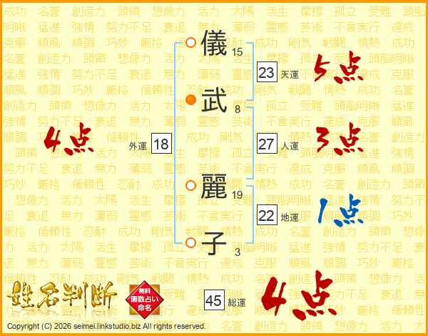 儀(15画)武(8画) 麗(19画)子(3画)