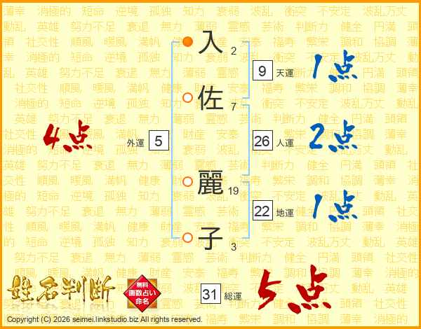 生活面を象徴する運勢です。外部から受ける影響力を表し、結婚運、家庭運や職場、環境への順応性を表します。総運から人運を引いた画数。姓や名が1文字の場合を除く。