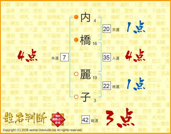 生活面を象徴する運勢です。外部から受ける影響力を表し、結婚運、家庭運や職場、環境への順応性を表します。総運から人運を引いた画数。姓や名が1文字の場合を除く。