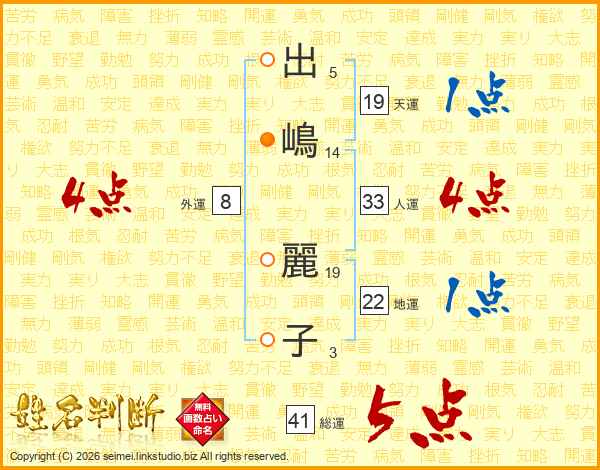 出嶋麗子さんの人運は33画の4点!
