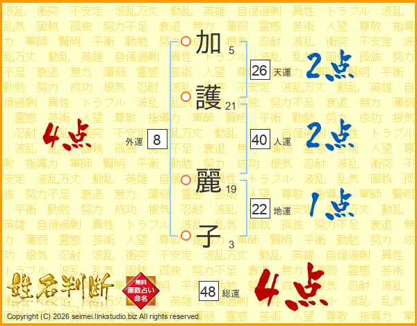加(5画)護(21画) 麗(19画)子(3画)