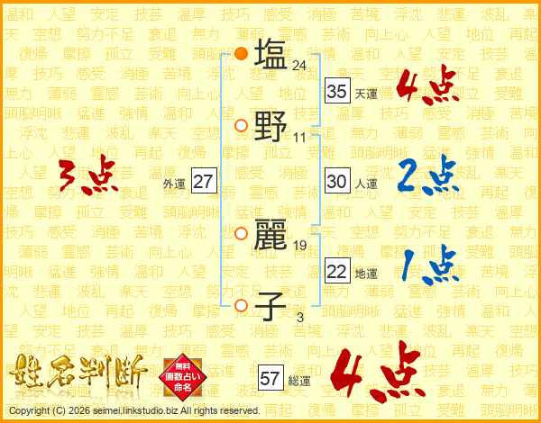 生活面を象徴する運勢です。外部から受ける影響力を表し、結婚運、家庭運や職場、環境への順応性を表します。総運から人運を引いた画数。姓や名が1文字の場合を除く。