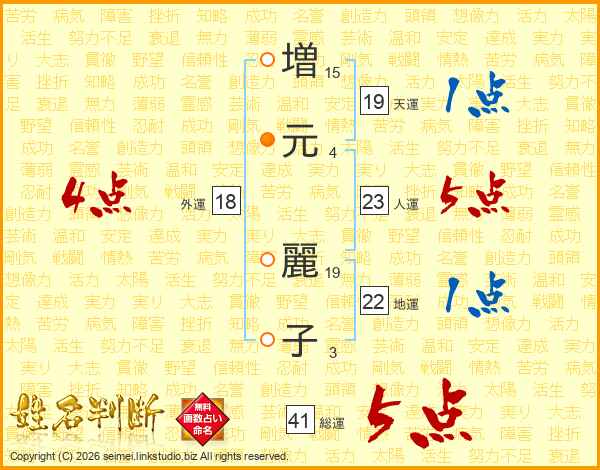 増(15画)元(4画) 麗(19画)子(3画)