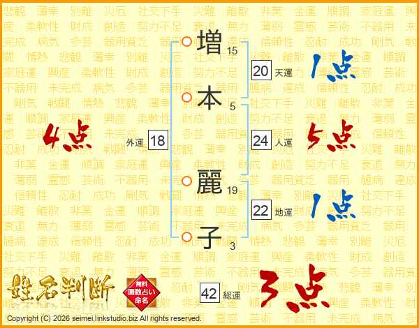 増(15画)本(5画) 麗(19画)子(3画)