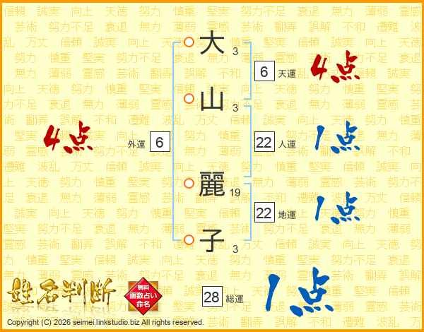 大(3画)山(3画) 麗(19画)子(3画)