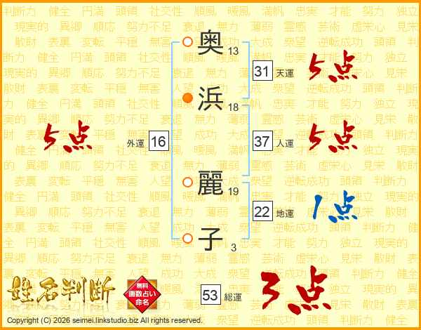 奥(13画)浜(18画) 麗(19画)子(3画)