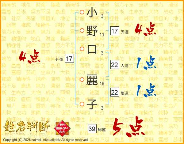小(3画)野(11画)口(3画) 麗(19画)子(3画)
