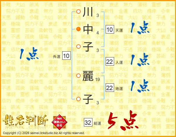 川(3画)中(4画)子(3画) 麗(19画)子(3画)
