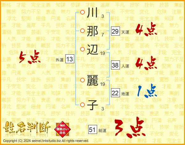 川(3画)那(7画)辺(19画) 麗(19画)子(3画)