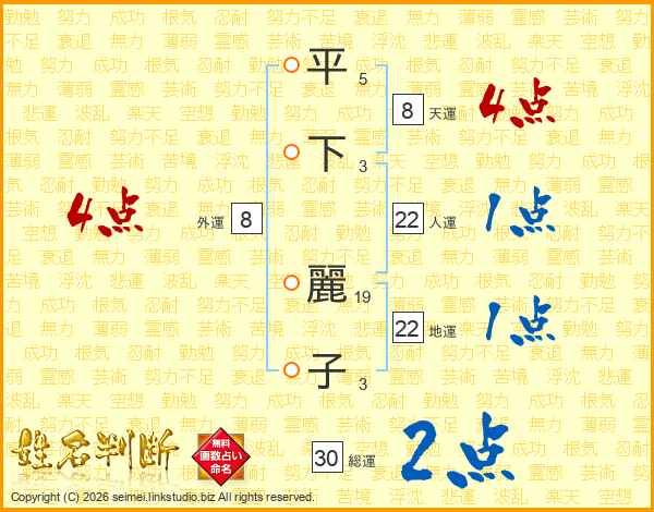 生活面を象徴する運勢です。外部から受ける影響力を表し、結婚運、家庭運や職場、環境への順応性を表します。総運から人運を引いた画数。姓や名が1文字の場合を除く。