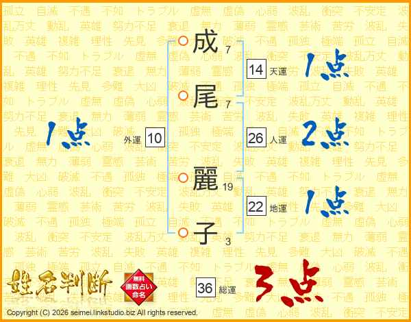 生活面を象徴する運勢です。外部から受ける影響力を表し、結婚運、家庭運や職場、環境への順応性を表します。総運から人運を引いた画数。姓や名が1文字の場合を除く。