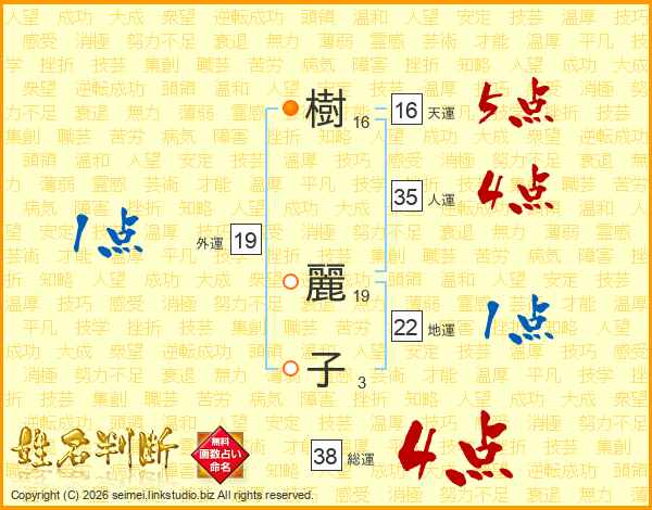 樹(16画) 麗(19画)子(3画)