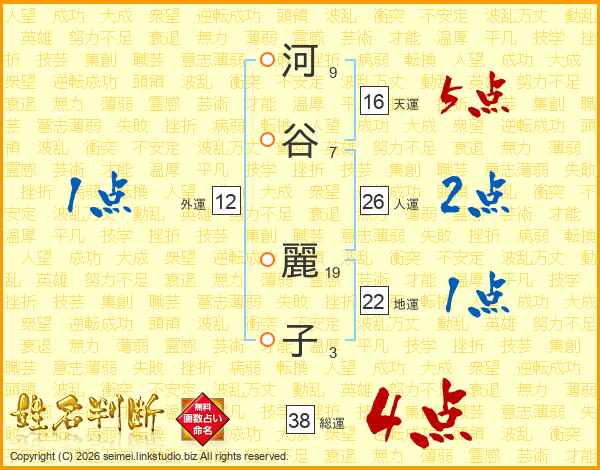 生活面を象徴する運勢です。外部から受ける影響力を表し、結婚運、家庭運や職場、環境への順応性を表します。総運から人運を引いた画数。姓や名が1文字の場合を除く。