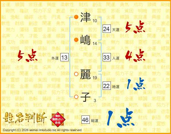 津(10画)嶋(14画) 麗(19画)子(3画)