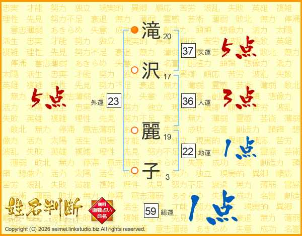 滝(20画)沢(17画) 麗(19画)子(3画)