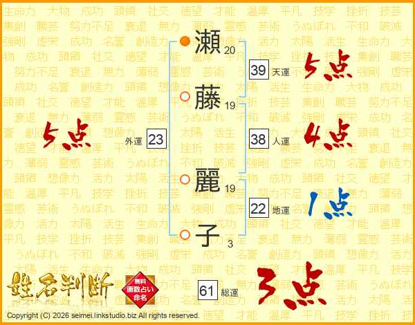 瀬(20画)藤(19画) 麗(19画)子(3画)
