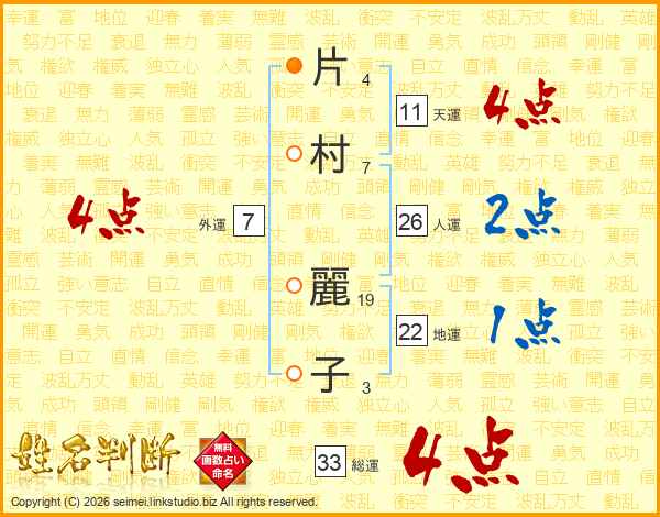 片(4画)村(7画) 麗(19画)子(3画)
