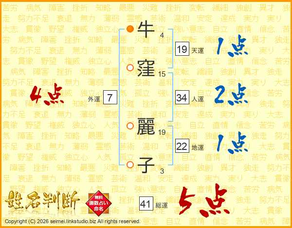 牛(4画)窪(15画) 麗(19画)子(3画)