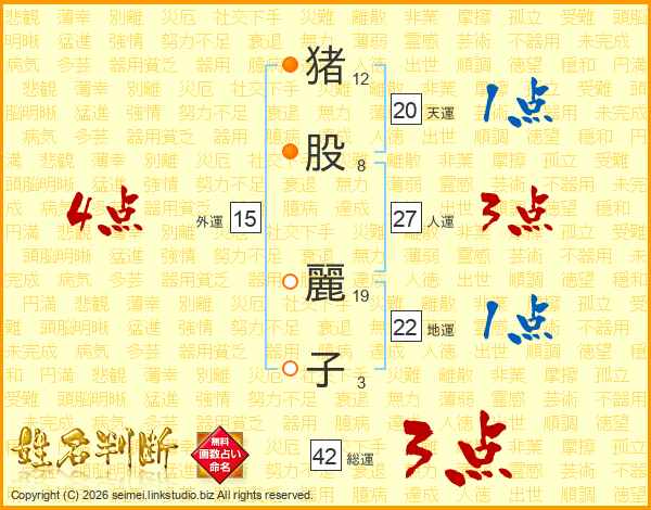 生活面を象徴する運勢です。外部から受ける影響力を表し、結婚運、家庭運や職場、環境への順応性を表します。総運から人運を引いた画数。姓や名が1文字の場合を除く。