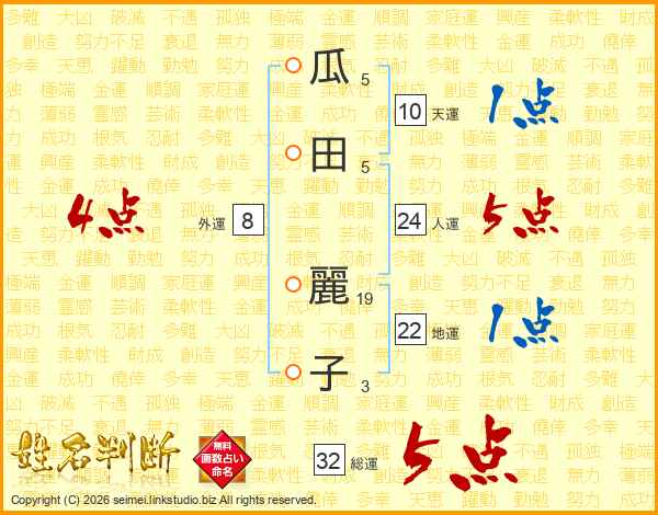 瓜田麗子さんの総運は32画の5点!