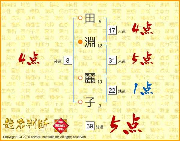 田(5画)淵(12画) 麗(19画)子(3画)