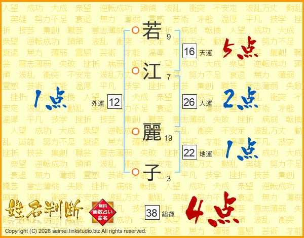 若(9画)江(7画) 麗(19画)子(3画)