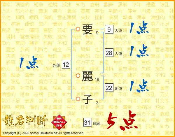 生活面を象徴する運勢です。外部から受ける影響力を表し、結婚運、家庭運や職場、環境への順応性を表します。総運から人運を引いた画数。姓や名が1文字の場合を除く。
